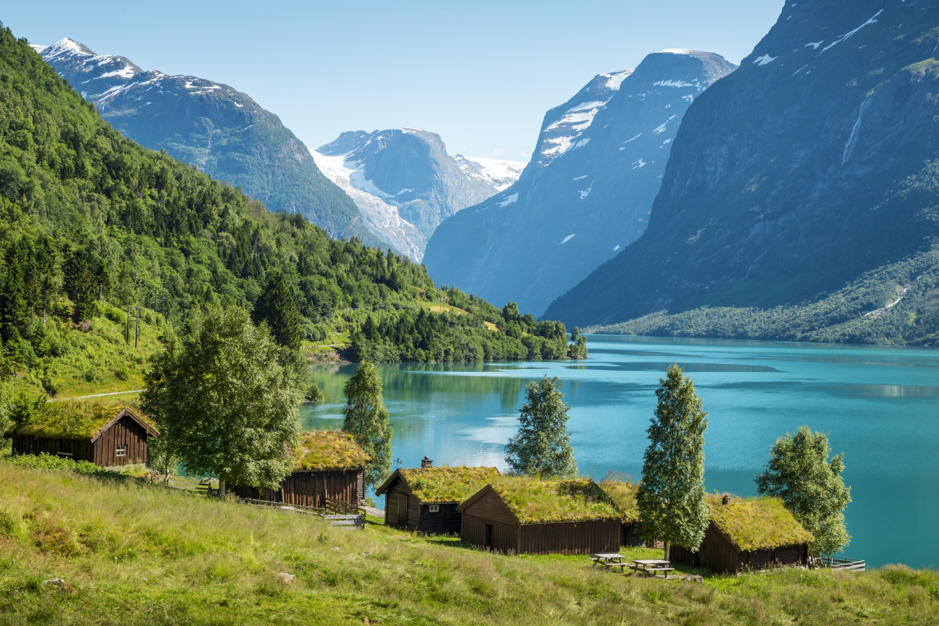 Panorama of norwegian landscape with traditional farm village