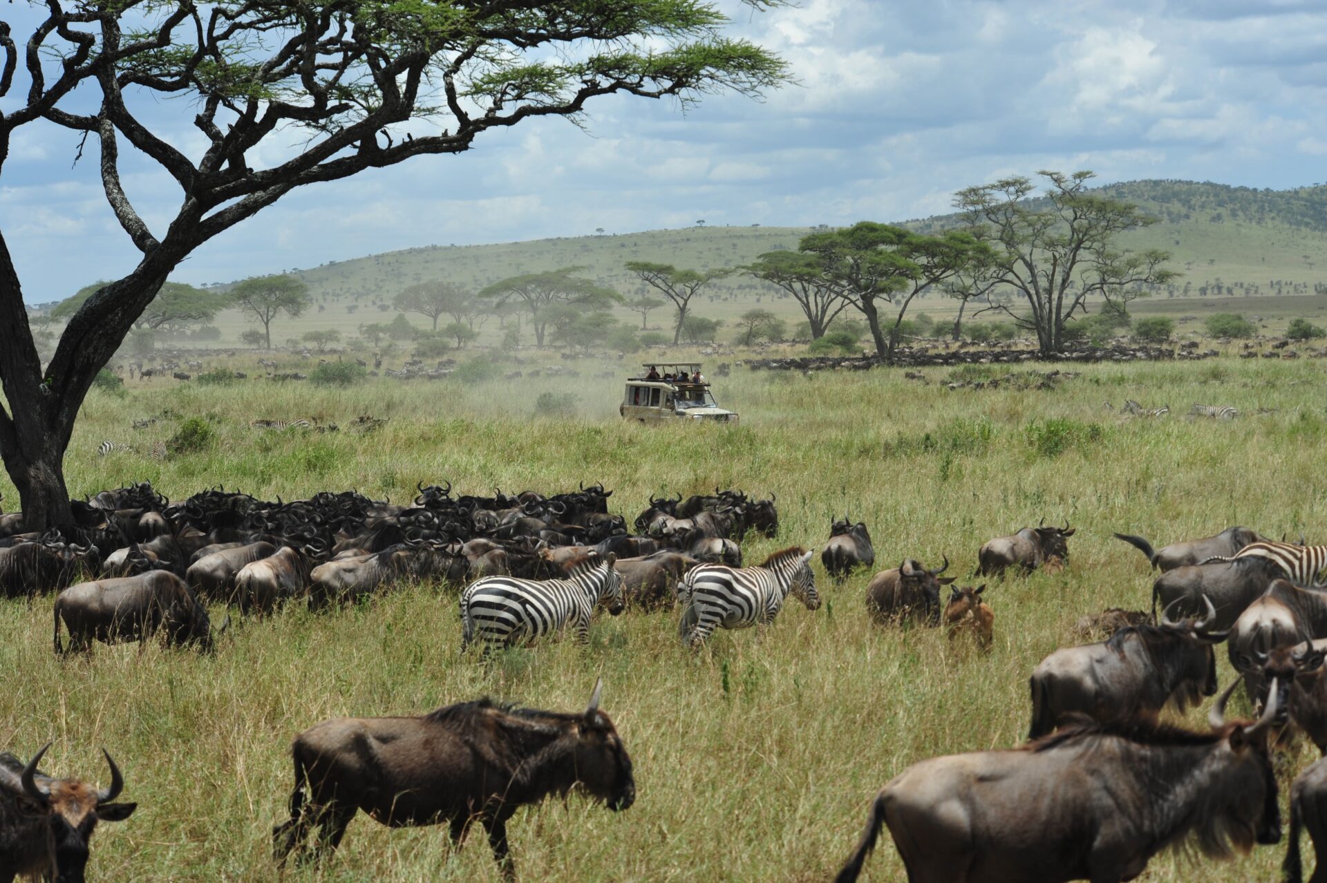 Intera giornata dedicata alla visita del Serengeti con fotosafari mattutini e pomeridiani. Qui ogni anno da dicembre a marzo più di un milione di gnu insieme con centinaia di migliaia di zebre migra passando dall’area del cratere dell’Ngorongoro all’area a sud del Serengeti Ndutu per risalire poi gradualmente nei mesi successivi a nord del Serengeti.