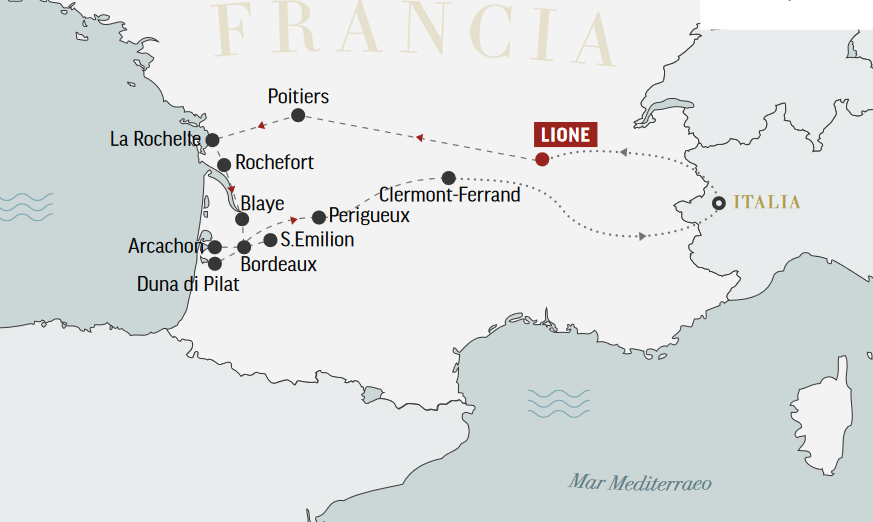 Ci sono viaggi che riescono a unire in armonia bellezza, arte, cucina e piacere. Questo tour è capace di regalare emozioni uniche: i vigneti che ricoprono i dolci pendii dell’Aquitania, l’architettura elegante di Bordeaux e Poitiers, la natura selvaggia e maestosa forgiata dai venti dell’Atlantico della Duna di Pilat, i sorprendenti edifici religiosi di Clermont- Ferrand e Perigueux.