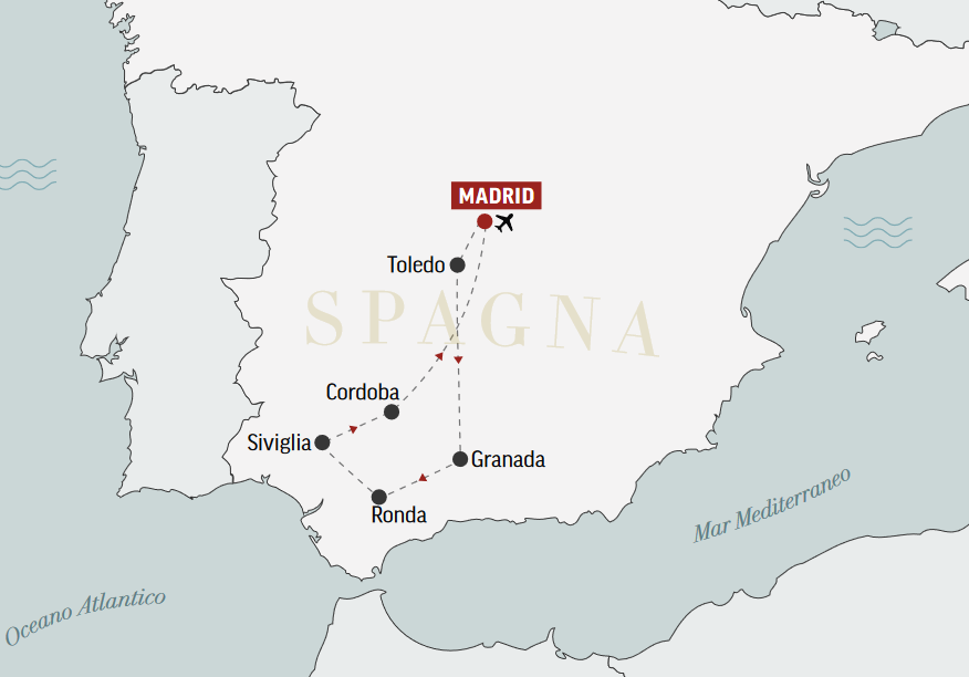 Granada, ricca di suggestioni moresche, a Toledo, adagiata su un colle circondato dal fiume Tago; da Siviglia profumata di aranci e gelsomini a Madrid con le sue notti vivaci.