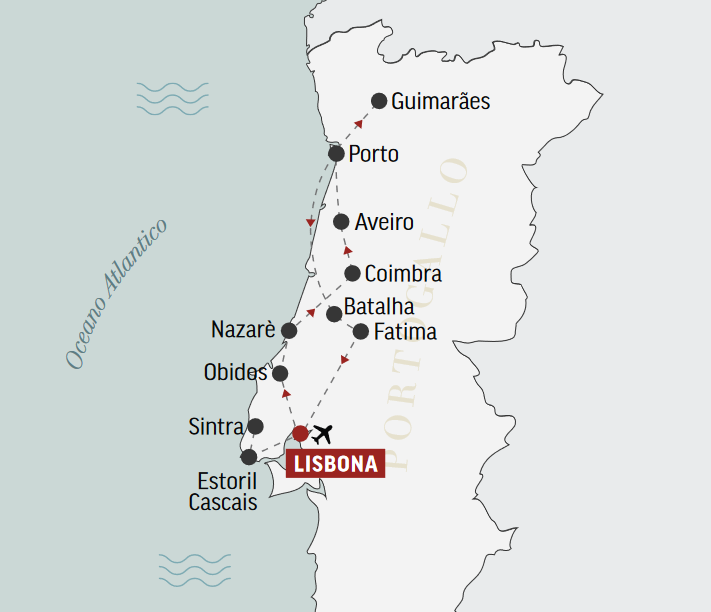 L’anima del Portogallo si svela in tutto il suo calore, fra città storiche e spaccati folkloristici: Lisbona, antica potenza marittima dagli scorci suggestivi, Porto con l’animato centro storico, Coimbra ricca di monumenti ricoperti di piastrelle cromatiche, fino a Batalha e alla mistica Fatima.